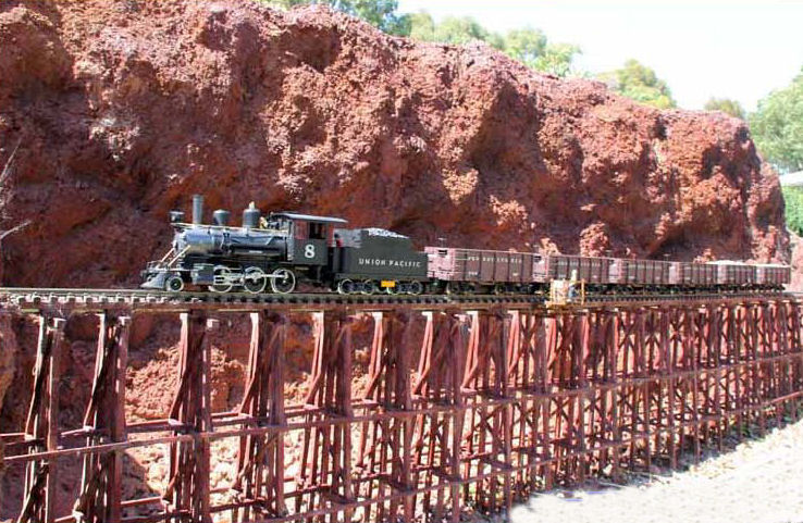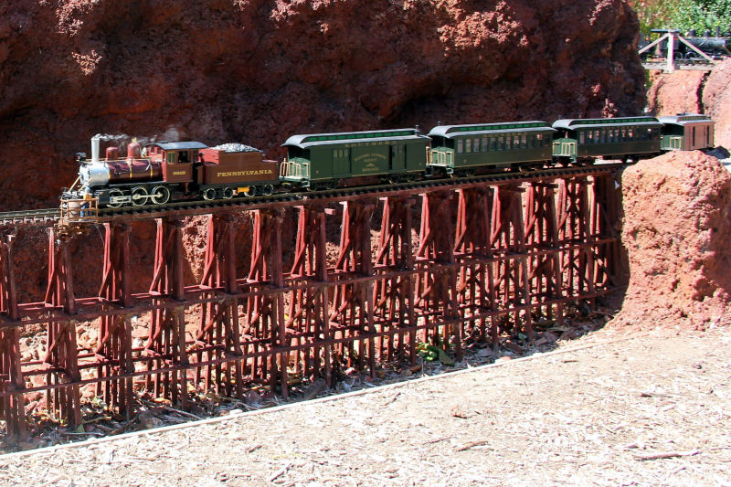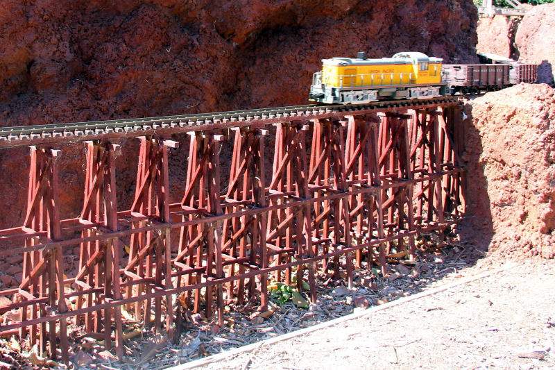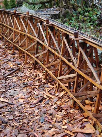 This trestle is a 3 story bent (660mm) but can be shortened to 2 stories (440mm) or 1 story (220mm) as necessary or increased to 5, even 6 stories, although that is about as high as major railroads built. Logging roads and similar backwoods outfits occasionally went higher, such as the lofty 120 foot trestle on Red Cabin Creek in Washington State's Skagit Valley. In any case, trestles were rarely scientifically engineered except on major standard gauge lines. There were many local modifications and you can alter the size of the timbers to suit your r.r.'s needs or to scale the material to a prototype. The major railroads normally use squared timbers, of course but, for a backwoods logging road, you should use suitably sized dowels, roughed up to resemble log pilings. This would be fitting on many small branch lines as well.